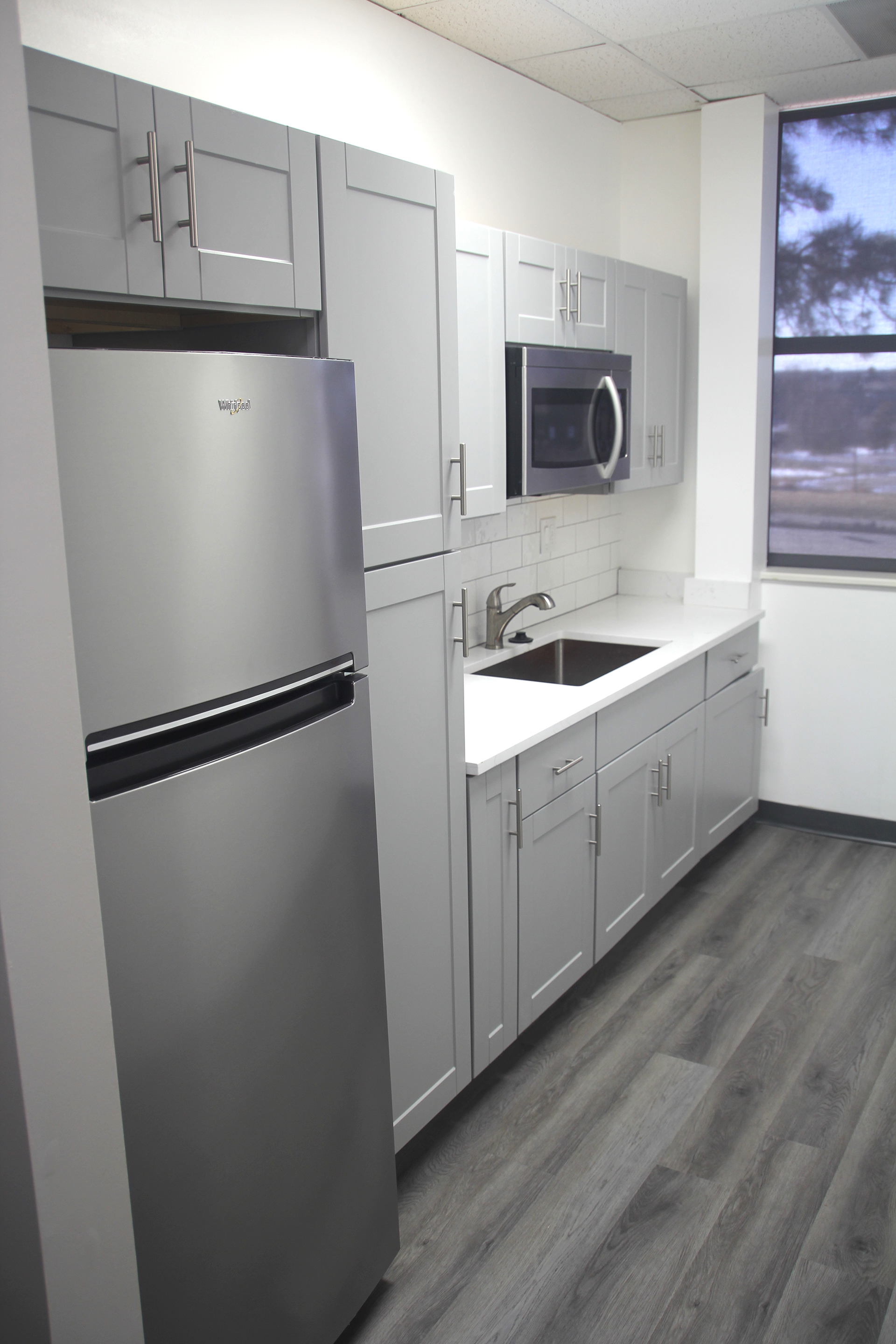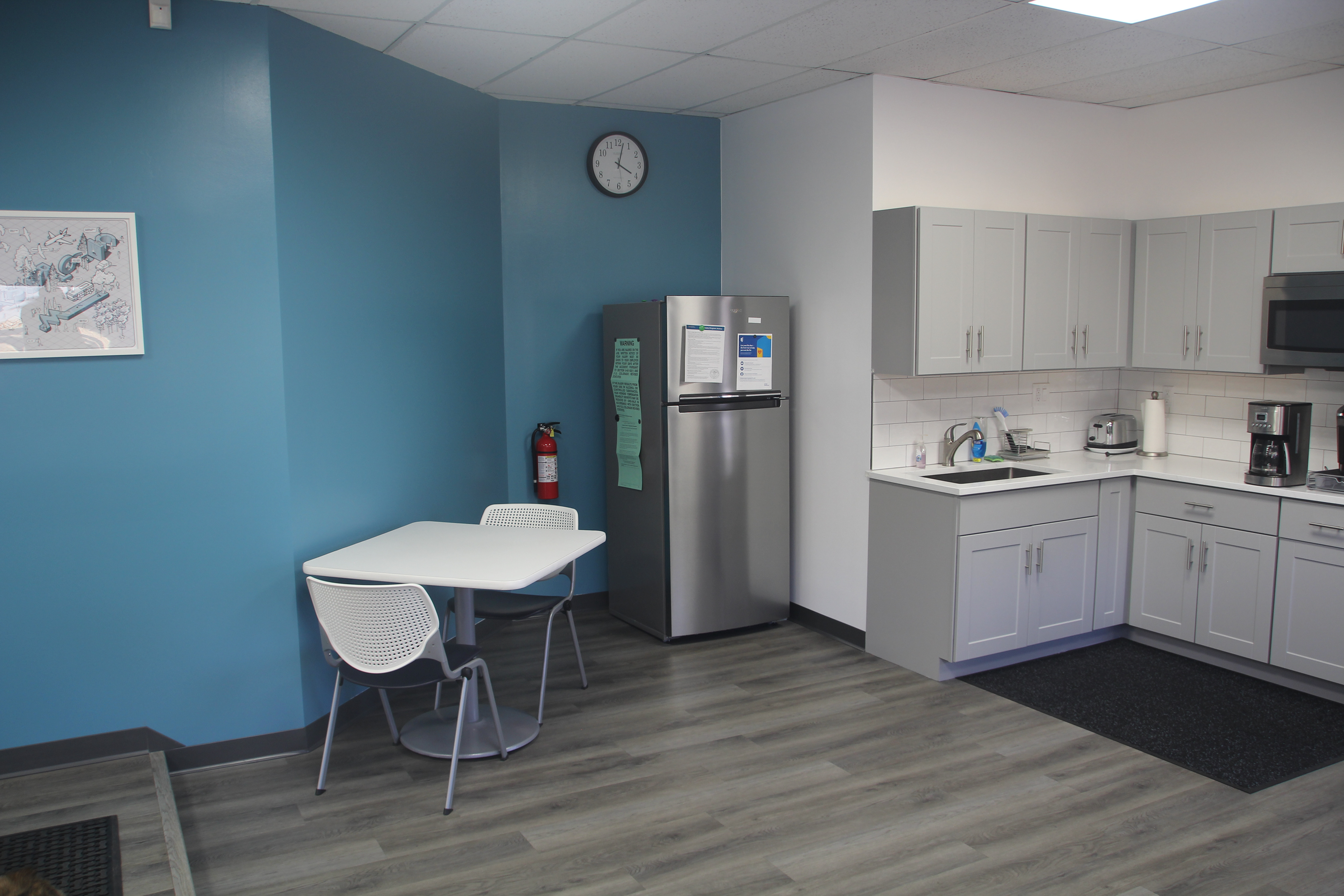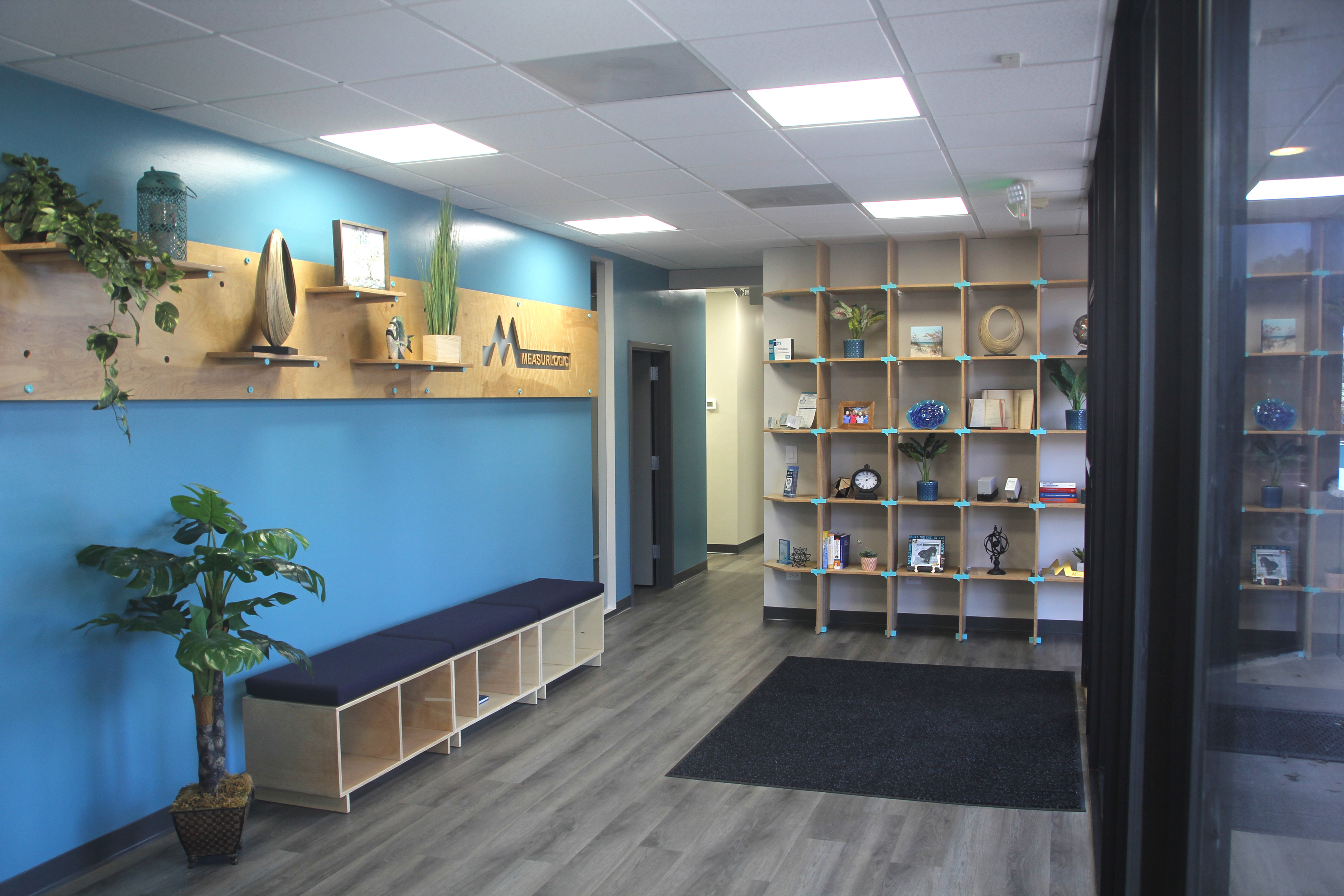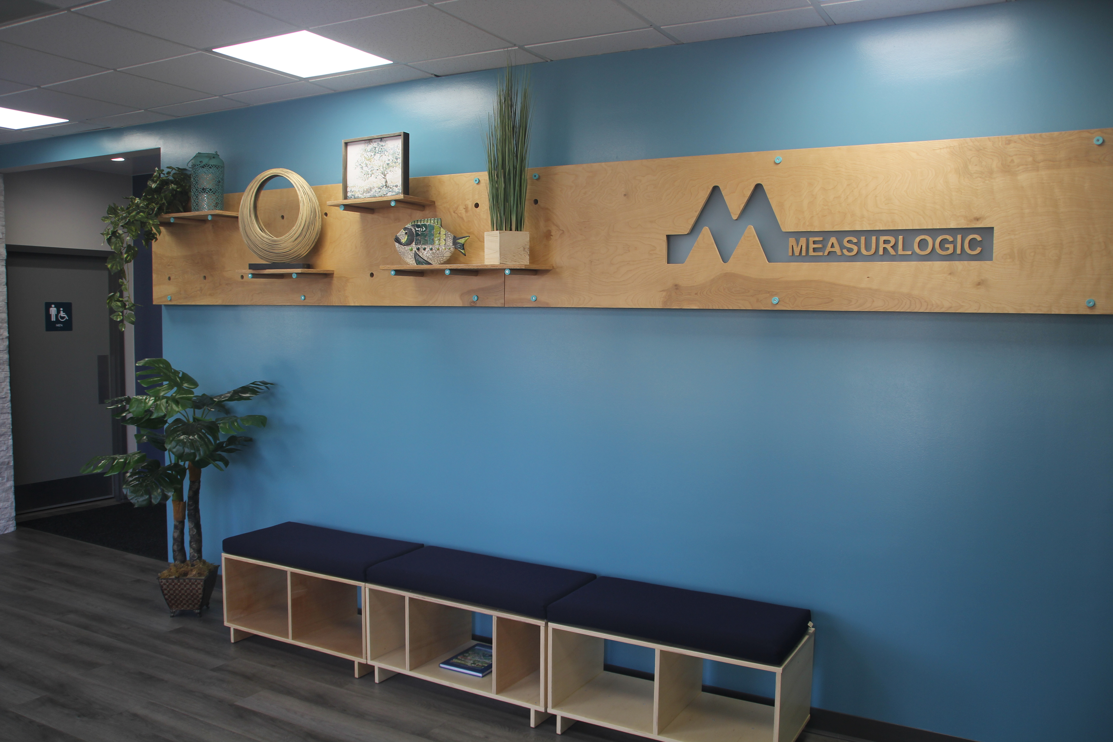 Measurlogic made the move from their rented, tenant space that they called home for over 10 years, across town to a dated 10,000 sqft building. The design process included gutting pieces of the original building, redoing the internal layout to better suit Measurlogic’s needs, facelifting everything including new flooring, wall treatments, bathrooms, and kitchen spaces. Other efforts such as furniture installations and overall layout, new internal & external signage design, new lighting, and new art areas were incorporated to give the space an updated and comfortable feel.